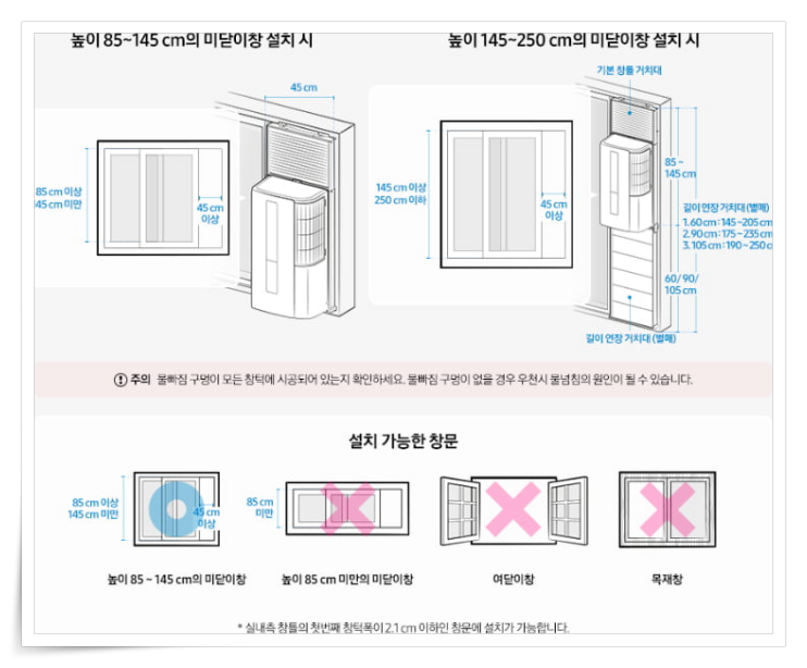 2) 기본 거치대 설치 환경은 창문을 열었을 때 가로 45cm 이상 세로는 85cm 이상 145cm 미만인데, 여기서 창틀 높이가 145cm 이상이라면 추가 연장 거치대를 사용하면 최대 250cm 높이까지 설치 가능.