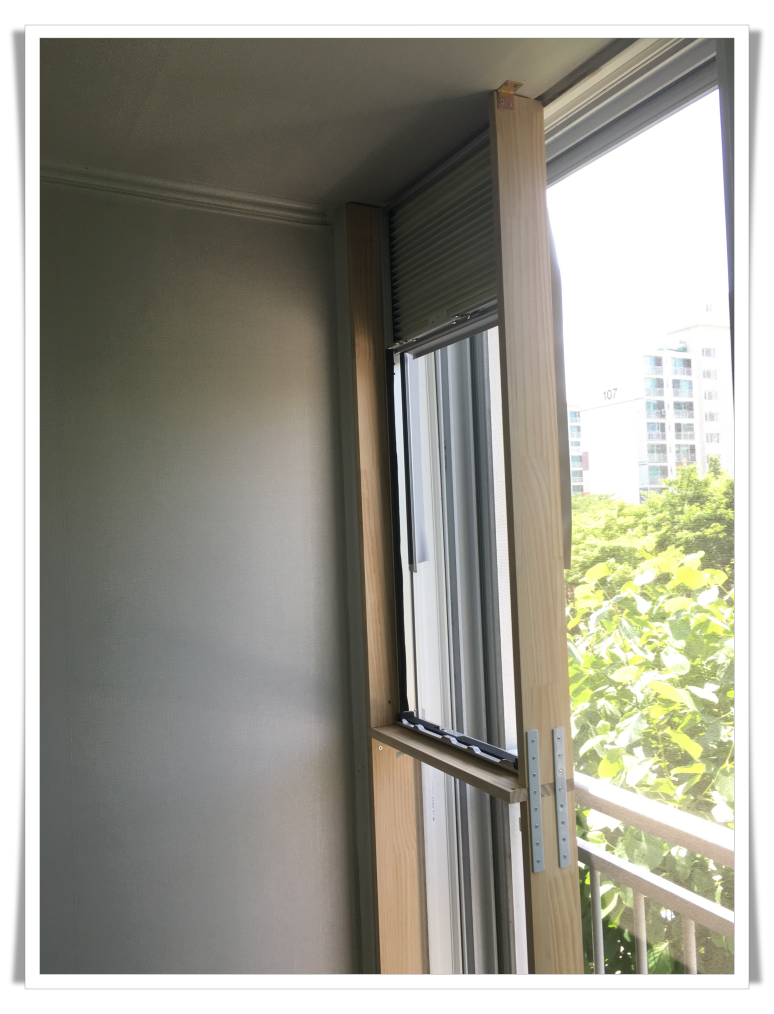 에어컨 거치대 윗부분은 창틀샤시 홈을 이용해 고정하였습니다. 물론 윗부분은 다행스럽게 쉽게 넘어갔지만 창틀 홈을 이용하지 못하더라도 고정은 어느 형태로든지 가능합니다. 물론 작업 난위도는 좀 올라가겠지만요.