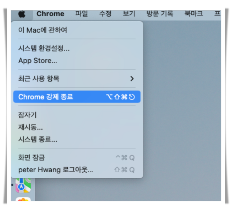 키조합 말고 메뉴 막대에서 Apple 메뉴를 누르고 "강제 종료'를 선택하여 강제 종료 대화 상자를 열 수 있습니다. 맥에서는 윈도에 비해 자주 사용하지 않아서 가끔 키조합이 생각이 나지 않을 때도 있습니다.